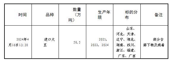 受中储粮油脂有限公司委托,2024年4月16日13:30在国家粮食和物资储备局粮食交易协调中心及联网的各省(区、市)湖北粮网组织开展进口大豆竞价交易,请交易会员通过湖北粮网官网()“用户中心”,登录国家粮食交易平台,在专场列表中选择“进口大豆竞价销售交易”参与交易。现就有关事项公告如下(重点提示内容详见加粗字体部分):